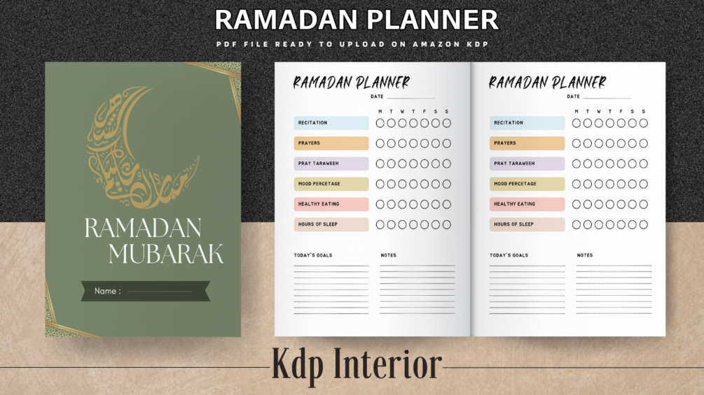 Ramadan planner KDP interior journal. Ramadan information notebook KDP interior. KDP interior logbook. Ramadan meal planner and experience tracker journal template. Fasting and Ramadan activity tracker notebook interior.